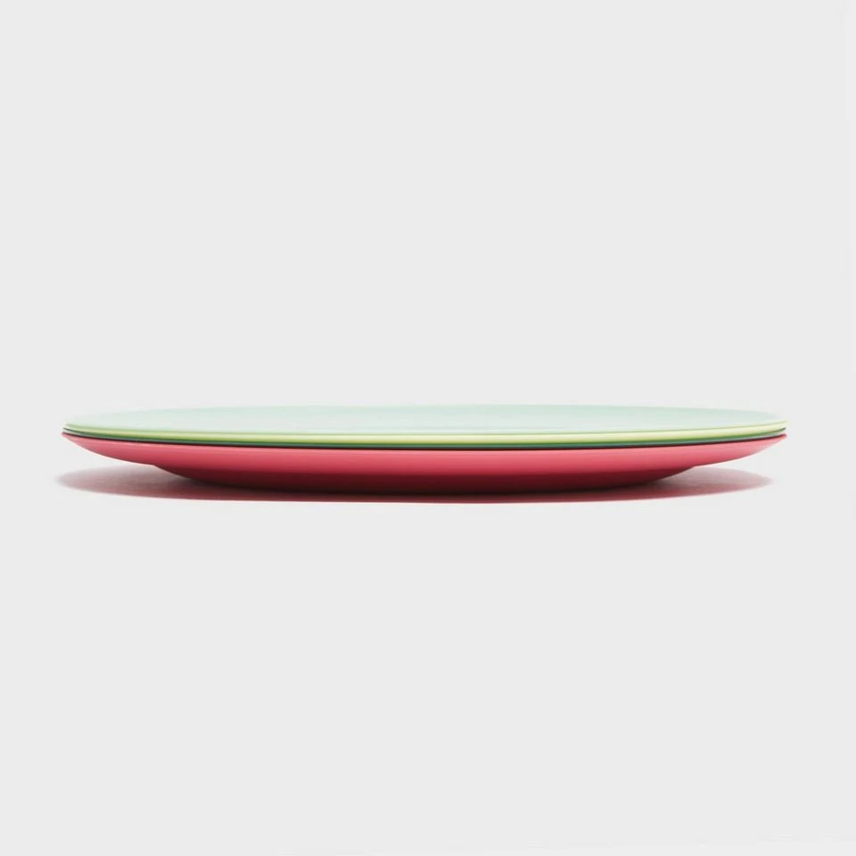 A set of four reusable plastic plates for the campsite, festival or family picnic.